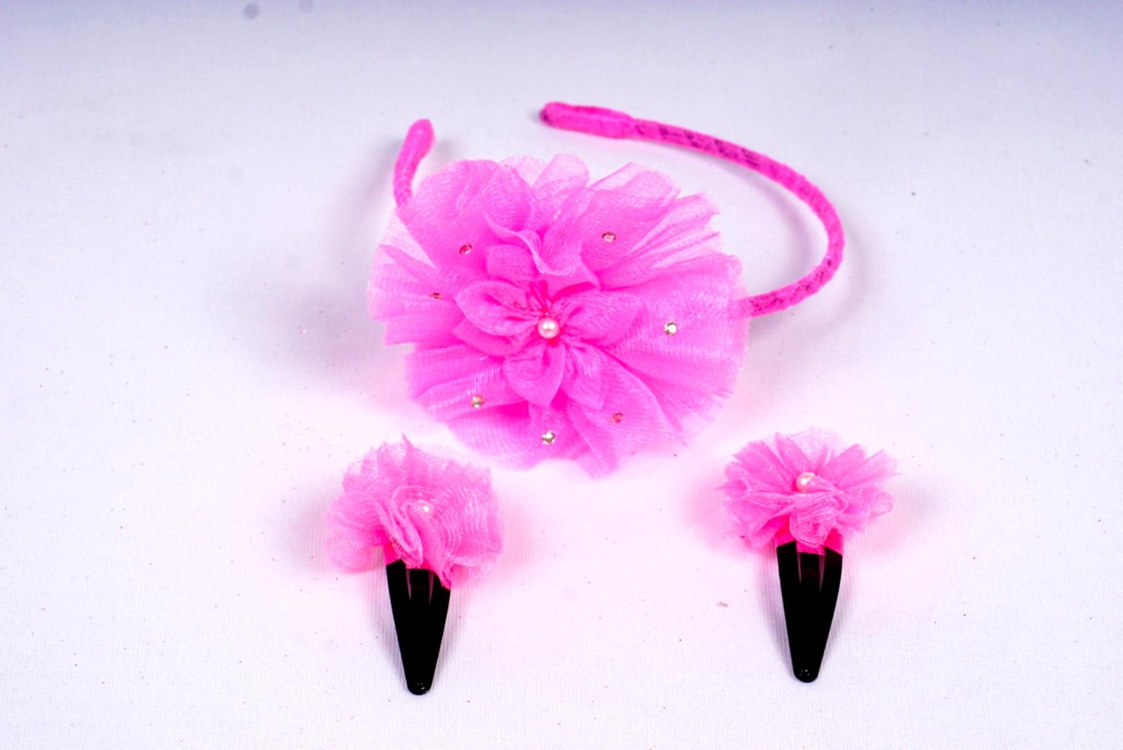 Antho Stylish Hair Band & Clip Set | Pink Net Cloth Floral Design Hair Accessories for Girls