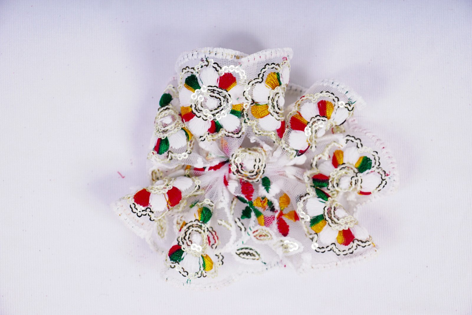 Add a touch of charm to your everyday hairstyle with our Bindu White Floral Embroidered Scrunchie, beautifully crafted with soft premium fabric and multicolor floral thread embroidery. Designed for comfort and style, this scrunchie provides a secure hold without damaging your hair, making it perfect for daily use.