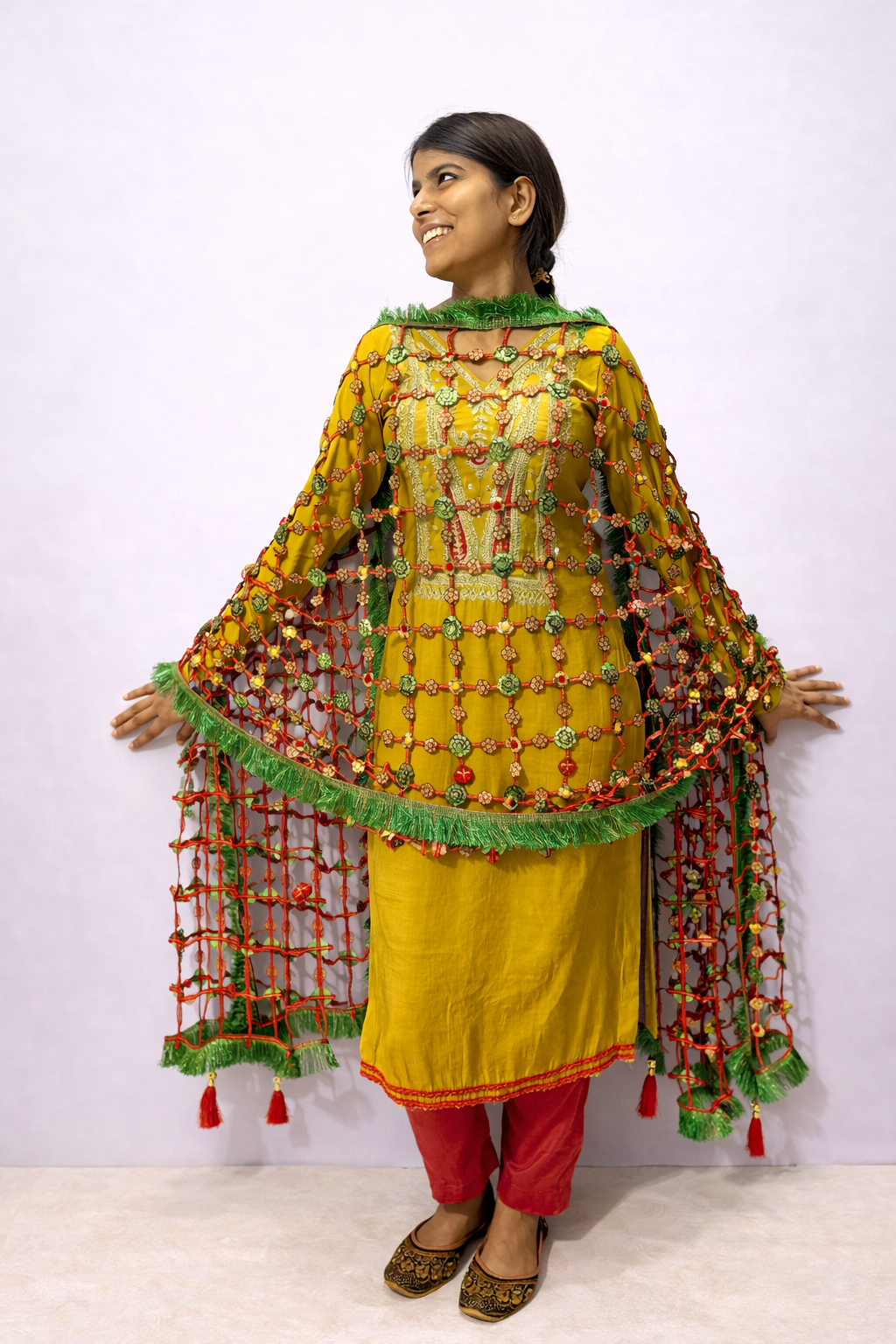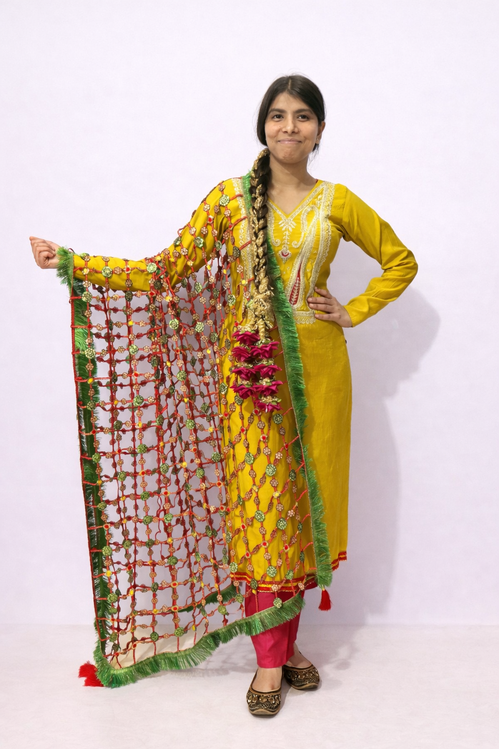 Add a vibrant touch of tradition to your wardrobe with this stunning Phulkari Embroidered Dupatta. Inspired by classic Phulkari artistry, this dupatta features intricate multicolor thread work arranged in a beautiful net pattern, giving it a rich and eye-catching appeal. The delicate mirror embellishments enhance its festive charm, making it perfect for special occasions.